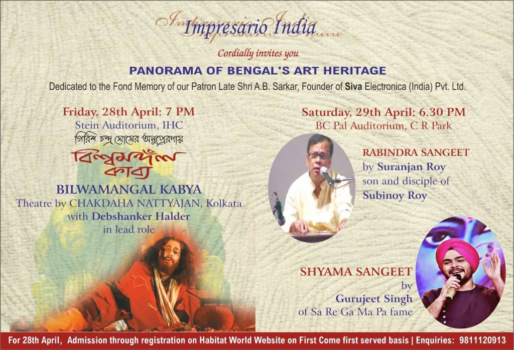 As part of ongoing initiatives to promote Bengali culture, Impresario India hosted a two-day Panorama of Bengal’s Art and Heritage, which featured Shri Deb Shankar Haldar, a well-known actor from Bengal, in Girish Ghosh inspired play Bilwamangal Kabya on Day 1 and a combination of Rabindra Sangeet and Shyama Sangeet on Day 2.