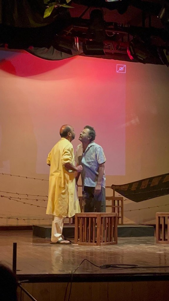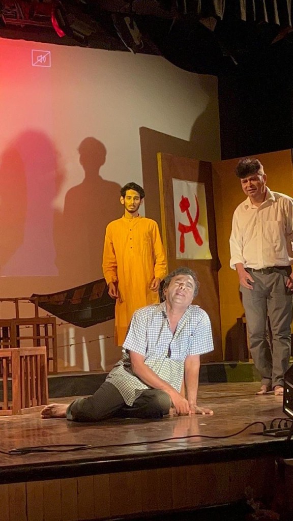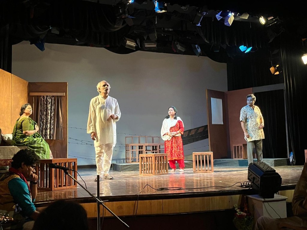 Another standout performance in the show was Prodeep Ganguly’s depiction as Sudhamoy, the elderly patriarch of the Dutta family. Prodeep gave the role a sense of gravitas with his commanding presence on stage and his  rich baritone voice. The dignified resilience with which Sudhamoy expressed his everlasting confidence in secularism in the face of rising violence added poignancy to his eventual breakdown. His portrayal of a guy who holds onto hope even as everything around him falls apart was poignant and powerful.