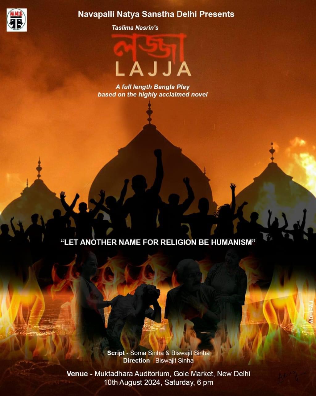 It is a brave and admirable endeavor by Navapalli Natya Sanstha to stage a full-length play based on Taslima Nasrin’s book Lajja. The novel is hard and provocative, making it a difficult work to adapt for the stage. It explores the pervasive concerns of religious intolerance and communal bloodshed in South Asia.